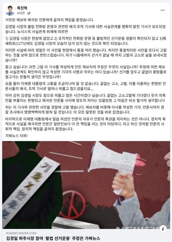▲ 목진혁 파주시의원이 자신의 페이스북을 통해 사실관계를 바로잡고 강력한 법적 대응 의지를 밝힌 게시물(4월 11일 페이스북 캡처)